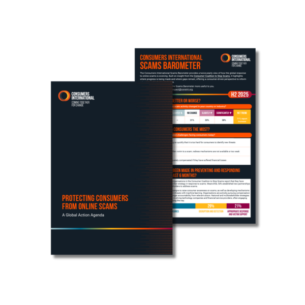 Protecting consumers in this fast-changing landscape requires harmonised global efforts, underpinned by strong national action. To support governments, consumer organisations and industry in building strategies, infrastructure, and partnerships needed for effective cross-border solutions, Consumers International has developed two new tools to guide their response: a Global Action Agenda to Protect Consumers from Online Scams and the Consumers International Scams Barometer.